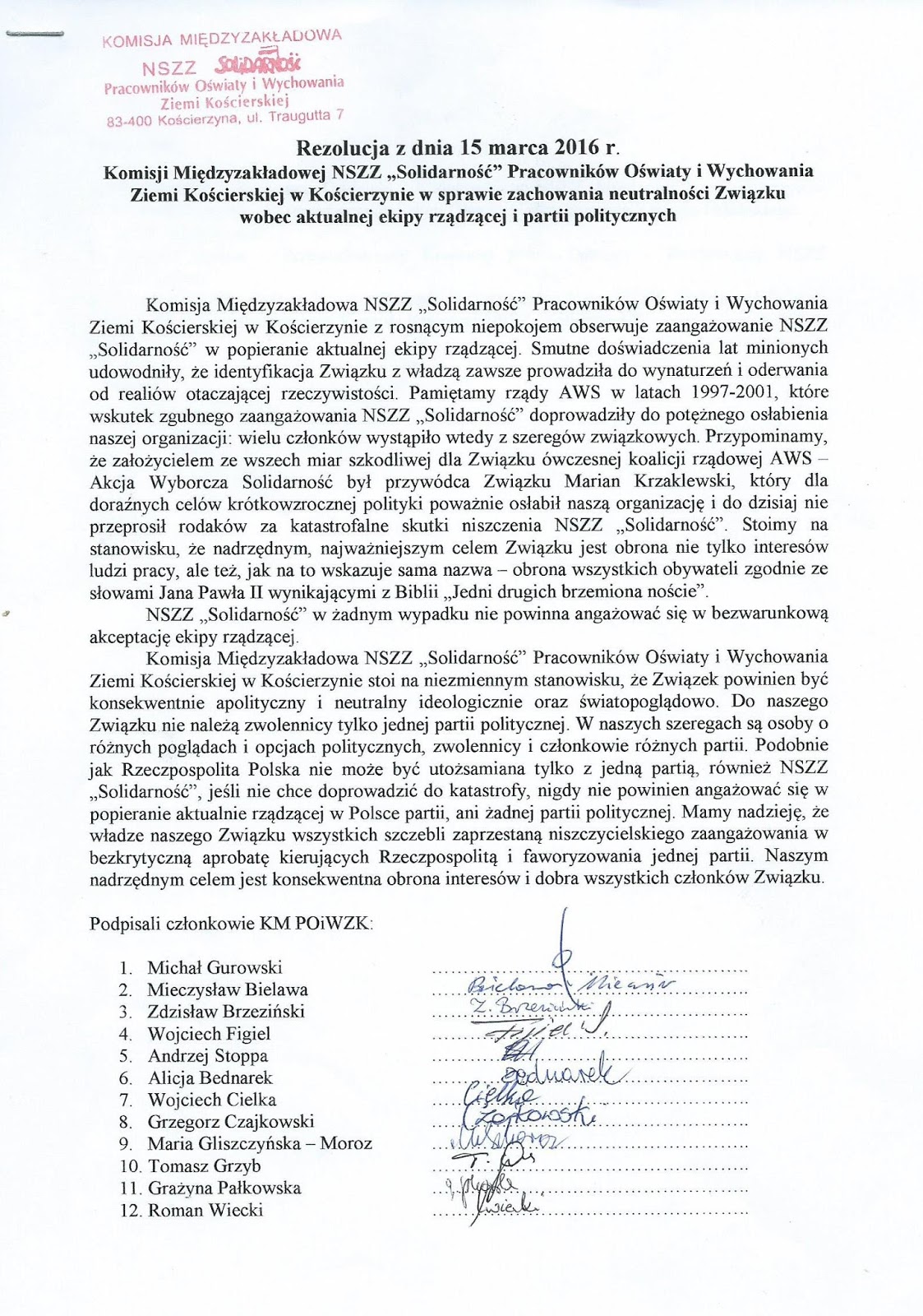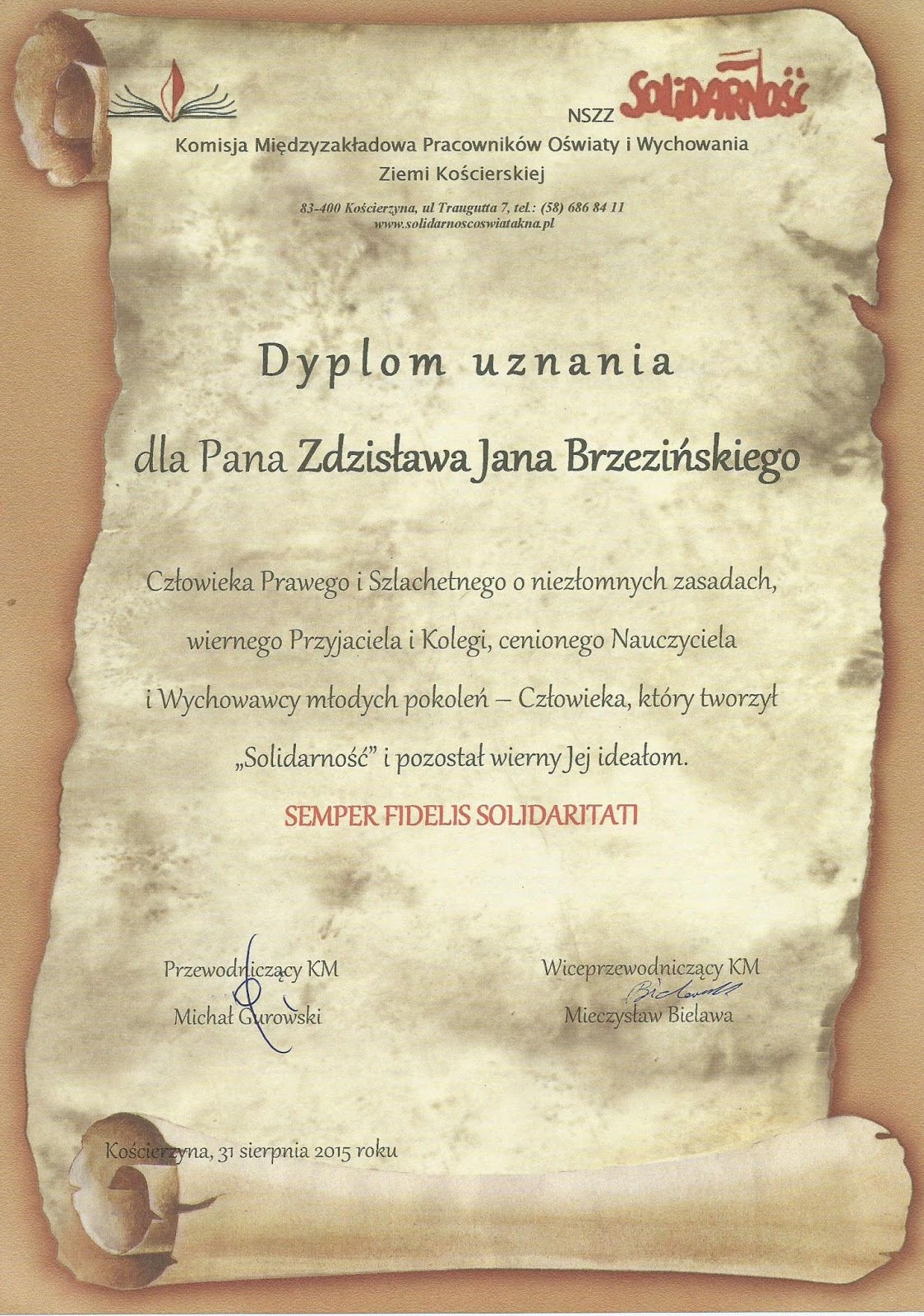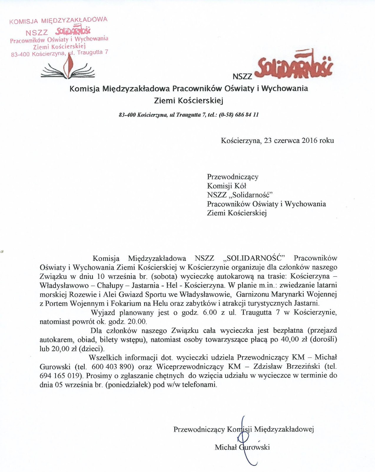 We wtorek, 24 maja 2016 r. siedzibę KM odwiedził Grzegorz Urowski, dyrektor (od 2012 r.) Powiatowego Zespołu Szkół Nr 3 w Kościerzynie przy ul. Kartuskiej 48, wcześniej przewodniczący naszej KM. Przy szkole działa Koło NSZZ „Solidarność”, liczące 5 czynnych nauczycieli z dyrektorem na czele. Przewodniczącym Koła jest Wojciech Cielka. Do Koła należy również Kazimierz Stoltmann, wieloletni zasłużony działacz NSZZ „S”, który w poprzednich latach przez 4 kadencje sprawował funkcję przewodniczącego naszej KM i wchodził w skład ścisłego prezydium Rady Sekcji Oświaty i Wychowania NSZZ „Solidarność” Regionu Gdańskiego.
