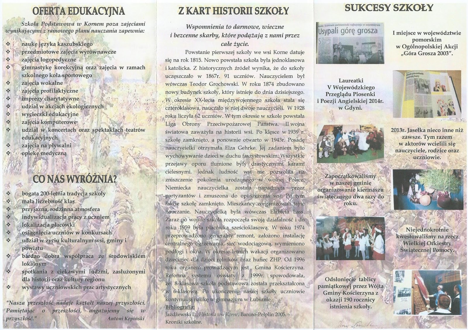 Nabożeństwo w Kościerzynie odprawiał ks. biskup ordynariusz Ryszard Kasyna i ks. Marian Szczepiński. Zapamiętaliśmy m.in. wypowiedź: bpa ordynariusza: „Zmieniajcie świat Waszą dobrocią i życzliwością.” Od 16.30 do 19.00 trwały uroczystości oficjalne na posesji szkolnej w Kornem. Biskup poświęcił również tablicę patrona szkoły. Wśród licznych gości byli zaproszeni przedstawiciele naszej KM: Michał Gurowski i Zdzisław Jan Brzeziński. Przybyli reprezentanci władz państwowych i samorządowych, w tym senator oraz kilku posłów. Najważniejszym uczestnikiem uroczystości był Andrzej Pilecki (85 lat), syn rotmistrza. Z. Brzeziński wręczył dyrektor Beacie Murglin egzemplarze „Życia Kaszub” dla szkolnej biblioteki, mówiąc, że to co zapisane - pozostanie i podkreślił obecność na uroczystości syna rotmistrza. Te egzemplarze zawierają artykuły o szkole w Kornem i o rotmistrzu Witoldzie Pileckim. Po części oficjalnej był poczęstunek. Stoły uginały się od wszelakiego jadła i napitków. Wszyscy goście otrzymali pamiątkowe upominki. Na uznanie zasługuje perfekcyjna organizacja niezapomnianej uroczystości. Pani Dyrektor, bardzo dziękujemy za niezwykłe przeżycia we wspaniałej szkole w Kornem i życzymy dalszego rozwoju placówki!