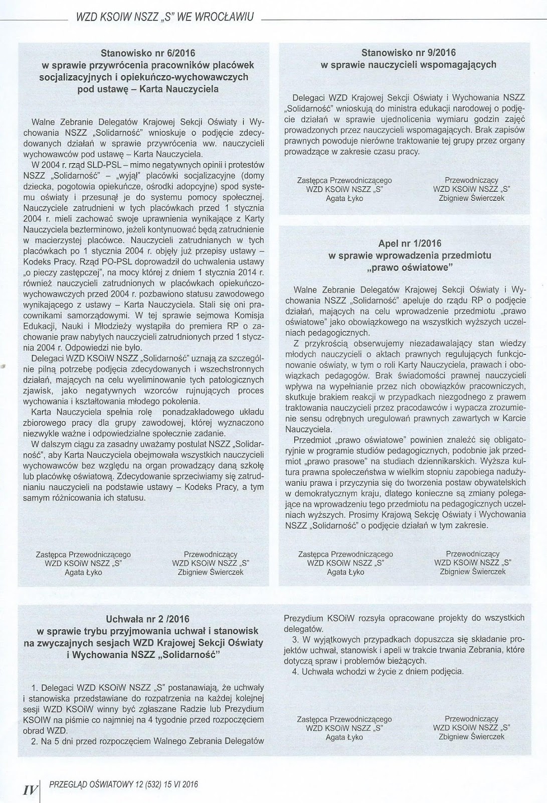 W dniach 19 i 20 maja 2016 r. przedstawiciel Komisji Międzyzakładowej POiW NSZZ „S” Ziemi Kościerskiej – Pan Michał Gurowski uczestniczył w pracach Komisji Konkursowych na stanowiska dyrektorów placówek oświatowych w Kościerzynie. W dniu 19 maja odbywał się konkurs na stanowiska dyrektorów Zespołu Szkół publicznych nr 2 oraz Szkoły Podstawowej nr 1, natomiast 20 maja – na stanowisko dyrektora Przedszkola nr 7. W wyniku przeprowadzonych konkursów kandydatem na dyrektora Zespołu Szkół Publicznych nr 2 została dotychczasowa dyrektorka – Pani Gabriela Kreft, natomiast kandydatem na dyrektora Szkoły Podstawowej nr 1 również dotychczasowy dyrektor – Pan Dariusz Kisielewski. Konkurs w celu wyłonienia kandydata na stanowisko dyrektora Przedszkola nr 7 nie został rozstrzygnięty. Nowo wybranym dyrektorom serdecznie gratulujemy i życzymy wytrwałości w realizacji zamierzeń oraz dobrej współpracy na rzecz kościerskiej oświaty. (Informację zredagował Michał Gurowski, przewodniczący KM NSZZ "Solidarność" POiWZK.