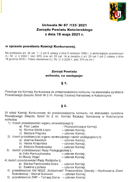 W marcu 2021 r. zostały przeprowadzone konkursy na stanowiska dyrektorów czterech placówek oświatowych w Kościerzynie. W pracach komisji uczestniczyli przedstawiciele naszej Komisji Międzyzakładowej NSZZ "Solidarność" P.O.iW.Z.K.: Michał Gurowski (przewodniczący KM) i Wojciech Figiel (wiceprzewodniczący KM).