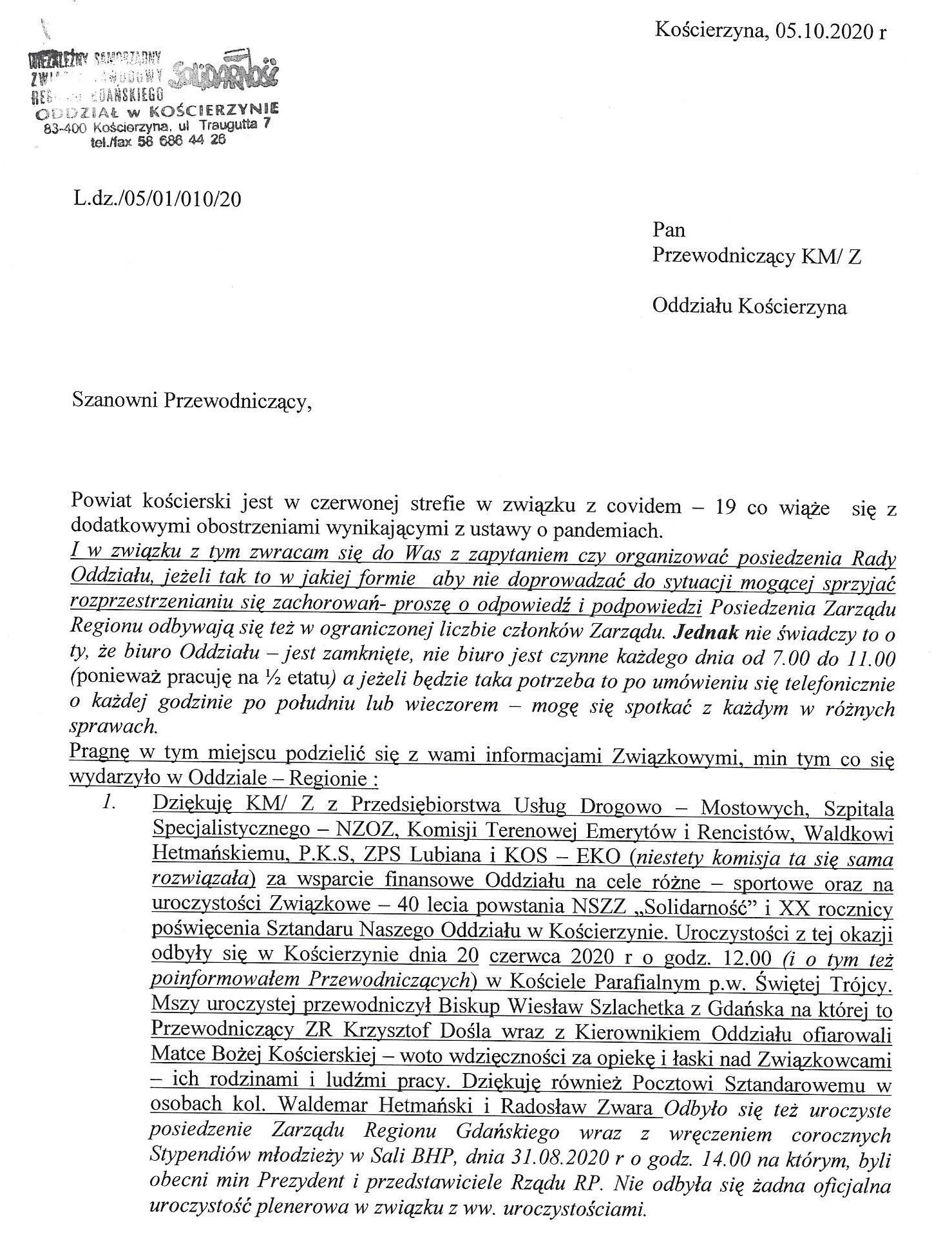 Anna Kocik wypowiedziała się w sprawie składanych wniosków o odznaczenia. Poinformowała, że część formularzy jest wypełniona bez należytej staranności, występują braki formalne, m.in. wpis danych o dowodzie osobistym, co powoduje odrzucanie wniosków. Jednocześnie podziękowała Komisjom Zakładowym, które odpowiedziały pozytywnie na jej apel o uregulowanie zaległych składek. Wśród wymienionych znalazła się równie? nasza KM w Kościerzynie. Niestety, na żadne, wielokrotne monity w ogóle nie reaguje KM Kartuzy (Piotr Zielkie).