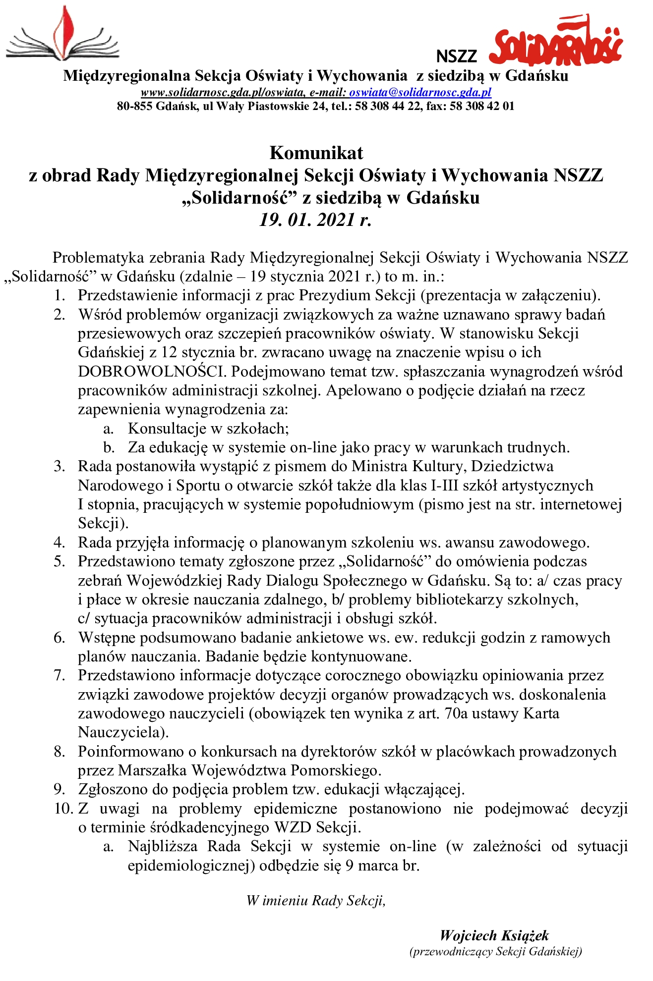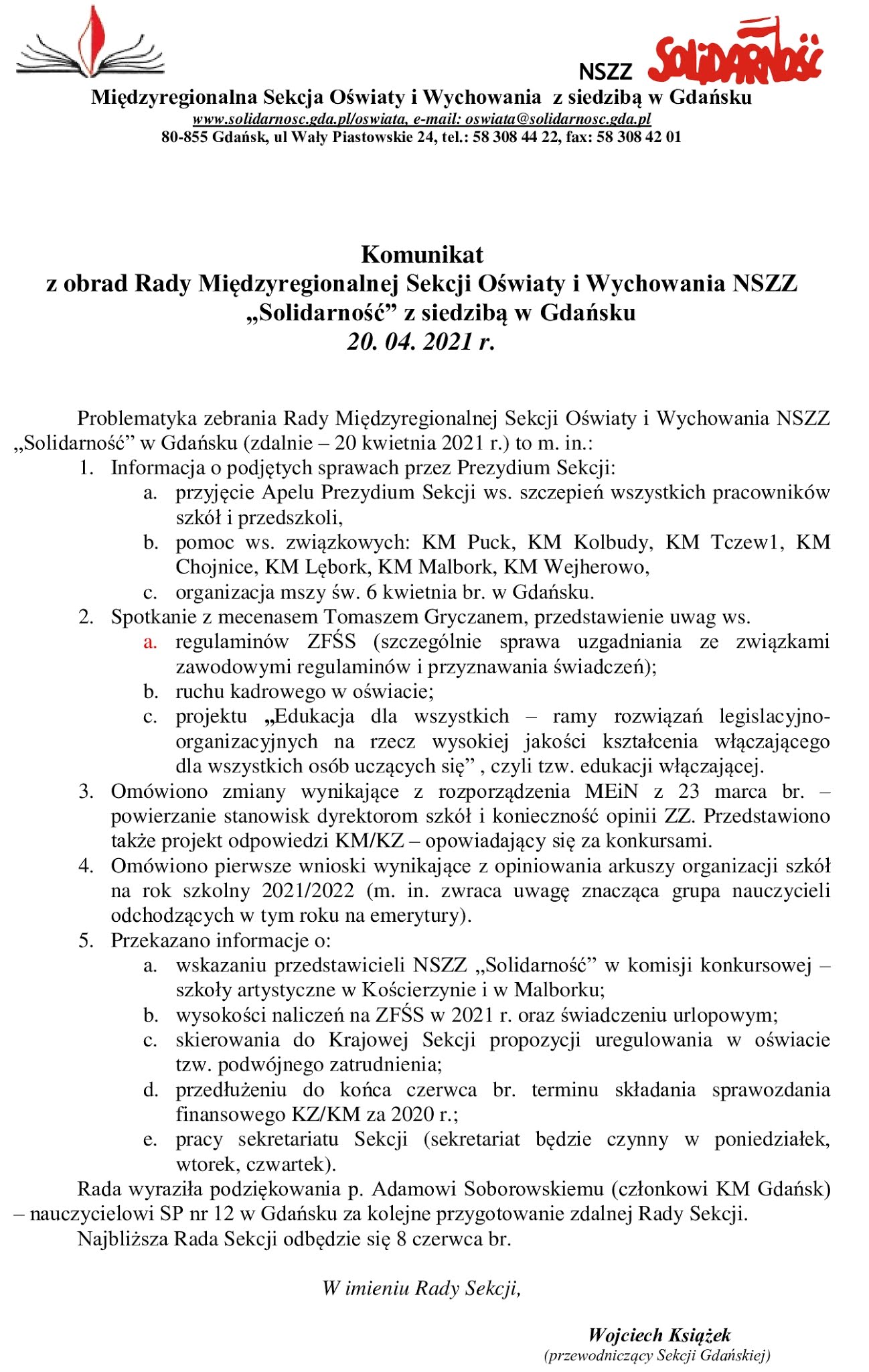Przewodniczący poinformował, że Sekcja Międzyregionalna liczy dokładnie 3573 członków, nauczycieli oraz pracowników administracji i obsługi. Po masowej rezygnacji z przynależności do Związku w 2019 r., ostatnio daje się zauważyć w niektórych placówkach wzrost liczby członków. Najwięcej, bo aż 1300 osób, liczy KM w Gdańsku. Padła ciekawostka: w stanie nauczycielskim mężczyźni są w mniejszości, stanowiąc tylko 18%. Co do odznaczeń, NSZZ S wystąpiła o pośmiertne przyznanie Złotego Krzyża Zasługi zasłużonemu mecenasowi, śp. Bogumiła Soczyńskiemu, zmarłemu w 2020 r. Mówiąc o trudnym czasie ciągle trwającej pandemii, Przewodniczący wspomniał o stratach i olbrzymim spustoszeniu, które wywołuje u młodego pokolenia zdalne nauczanie. Poza tym bardzo źle wpływa na uczniów brak relacji rówieśniczych, zanika empatia, wzrasta zapotrzebowanie na pomoc pedagogów i psychologów. W najbliższych tygodniach ważnym zadaniem związkowców będzie opiniowanie projektów arkuszy organizacyjnych szkół na rok szkolny 2021/2022. Te projekty przewodniczący KM powinny otrzymać do wyrażenia opinii do Wielkiego Piątku, 2 kwietnia 2021 r. ZZ maj? czas na zaopiniowanie 10 dni roboczych - do 19 kwietnia br. Należy bezwzględnie korzystać z tego uprawnienia Związków Zawodowych zagwarantowanych ustawowo, bo w ten sposób można wpływać pozytywnie na zatrudnienie nauczycieli i pracowników oświaty. Od stycznia 2021 r. najniższe wynagrodzenie wynosi 2800 z? brutto, co powoduje, że wynosi prawie tyle samo co pensja nauczyciela kontraktowego. Ustalono, że najbliższe posiedzenie Rady Sekcji odbędzie się online po przerwie wielkanocnej, we wtorek, 13 kwietnia 2021 r.