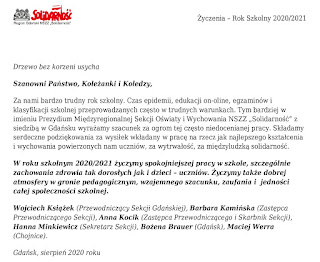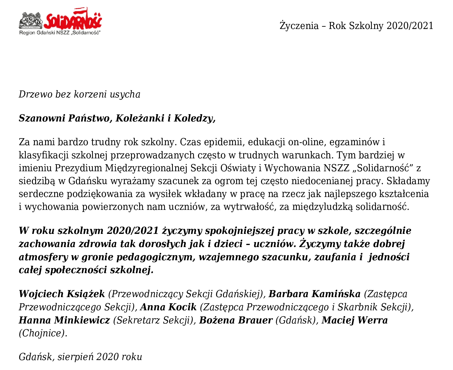 � przygotowanie ?ycze?-podzi?kowa? na rok szkolny 2020/2021 cz?onkom NSZZ �Solidarno??� i wszystkim ludziom zwi?zanym z o?wiat? z pro?b? o ich udost?pnienie w szko?ach (s? do pobrania, jak i inne materia?y na str. Sekcji