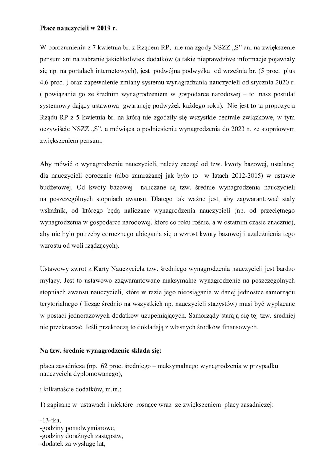 - Przedstawiciele Organizacji Związkowych przekazali informacje –wnioski wynikające z zawieszonej akcji protestacyjnej (sporów zbiorowych). Zwracano uwagę na różne podejście do potrąceń za czas strajku (w tym m. in. problem dodatków za wysługę lat, dodatku wiejskiego, dodatków funkcyjnych). Mecenas Tomasz Gryczan przedstawił opinię prawną w tym zakresie (uznającą że w/w dodatki były potrącane niesłusznie), która zostanie przesłana do organizacji związkowych.