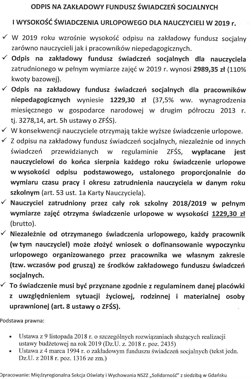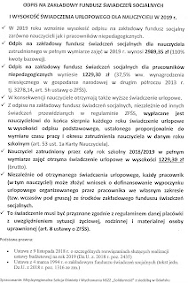 - Przekazano materiały związane z naliczaniem funduszu socjalnego oraz wysokością świadczenia urlopowego, które w 2019 r. wynosi 1.229,30 zł