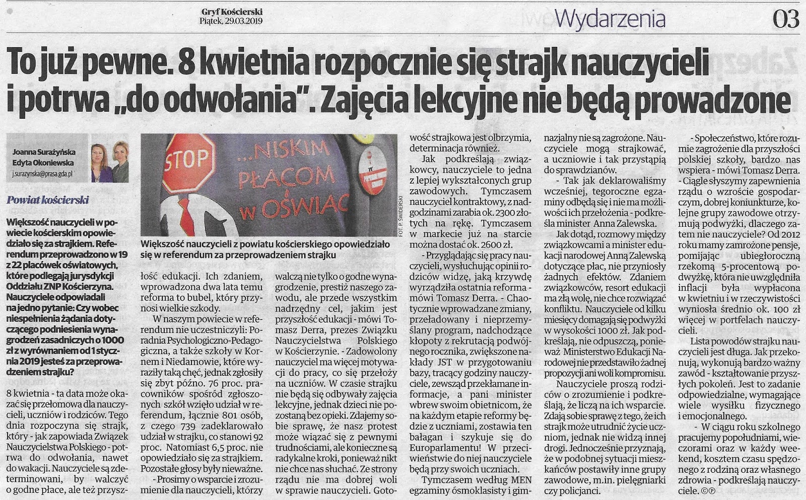 W posiedzeniu uczestniczyli m.in. Michał Gurowski (przewodniczący) i Zdzisław Jan Brzeziński z KM Kościerzyna. Podczas zebrania: a/ Przedstawiono sytuację strajkową na terenie działania poszczególnych organizacji związkowych. W większości z ok. 300 szkół/placówek oświatowych, gdzie struktury „S” przeprowadziły referenda sporu zbiorowego, strajk rozpoczął się 8 kwietnia br. Przypomniano, że Sekcja w ub. tygodniu wysyłała „Apel do dyrektorów szkół”. b/ Członkowie Rady, Przewodniczący KZ/KM podkreślali, że nie zachodzą przesłanki do odwołania lub zawieszenia strajku, który jest kontynuowany. c/ Przyjęto uchwałę wzywającą przewodniczącego Krajowej Sekcji Oświaty i Wychowania NSZZ „Solidarność” p. Ryszarda Proksę do rezygnacji z funkcji za „Upolitycznienie działań i decyzji KSOiW przez jej Przewodniczącego, chaos w przedstawianiu postulatów sporu zbiorowego i sposób prowadzenia negocjacji z Rządem”. Zobowiązano delegatów Sekcji (10 osób) do podjęcia inicjatywy zwołania w trybie pilnym nadzwyczajnego WZD KSOiW. d/ Omówiono tekst „Porozumienia”. Zwracano uwagę na część korzystnych zapisów dla nauczycieli. Akcentowano znaczenie posługiwania się wynagrodzeniami zasadniczymi a nie średnimi, które zaciemnieją obraz sytuacji. Zwracano uwagę na potrzebę wielkiej pracy koncepcyjnej, prawnej, by wdrożyć propozycje ustawowe, dotyczące systemu wynagrodzeń, gdy coraz bliżej jest czas przed wyborami parlamentarnymi. Korygowano, że średnioroczna podwyżka płac dla nauczycieli w 2019 r. to nie 15% (5% od 1 stycznia br. i planowana 9,6% dopiero od 1 września br.). e/ Przedstawiono – z udziałem radcy prawnego Iwony Jarosz-Lipkowskiej – odpowiedzi na pytania strajkowe oraz kolejne projekty dokumentów. f. W sprawach innych omówiono szczegóły prawne opiniowania projektów organizacji szkół – uprawnienie związków zawodowych do 19 kwietnia br.