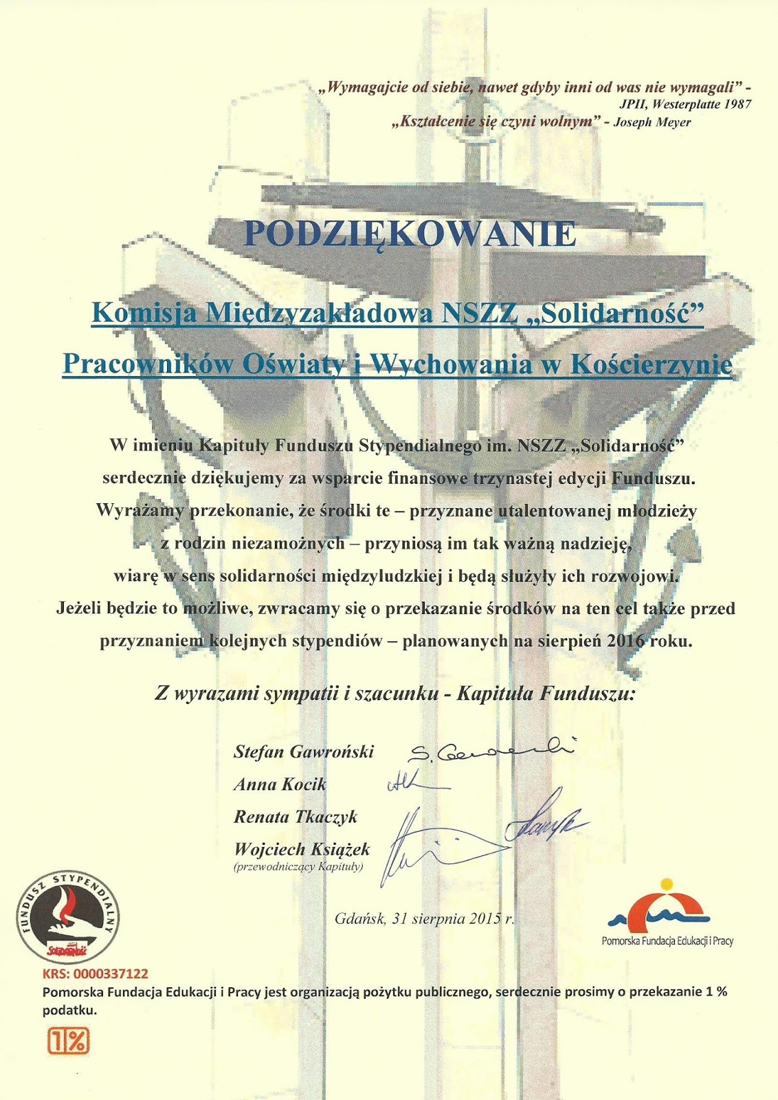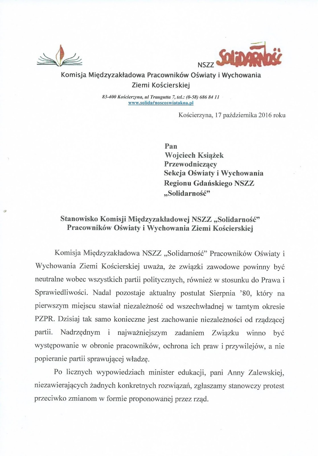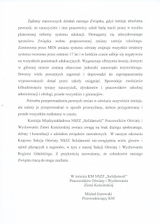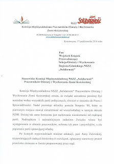 We wtorek, 8 listopada 2016 r. NSZZ Sekcja Oświaty i Wychowania Regionu Gdańskiego przyjęła następującą uchwałę: