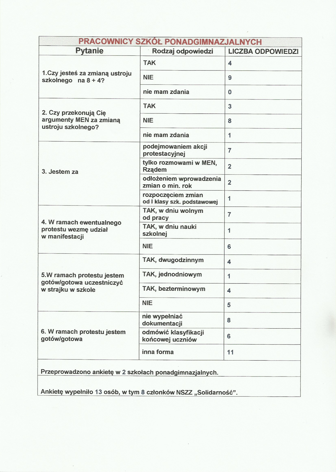 Dziękujemy Państwu za wypełnienie ankiet. Wynika z nich jednoznacznie, że zdecydowana większość członków Kół NSZZ "Solidarność" Pracowników Oświaty i Wychowania Ziemi Kościerskiej jest PRZECIW szkodliwej reformie edukacji przygotowywanej przez aktualną ekipę rządzącą. Prawie wszyscy opowiadamy się przeciwko likwidacji gimnazjów. Niestety, nasze władze centralne popierają złe zamiary rządzących, nie przejmując się wolą większości szeregowych związkowców. W sobotę, 19 listopada 2016 r. liczna grupa członków NSZZ "Solidarność" przyłączyła się do ogólnopolskiej manifestacji "NIE DLA CHAOSU W SZKOLE", która została zorganizowana przez ZNP.